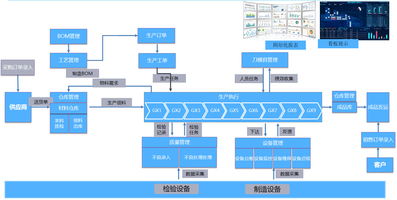 平台包括主数据管理、销售管理、采购管理、计划管理、生产管理、质量管理、仓储管理、设备管理、模具及工装管理、大数据看板等功能模块。各功能模块统一集成,构建从设计到工艺、生产、质量、设备和信息化全面集成的闭环业务体系。